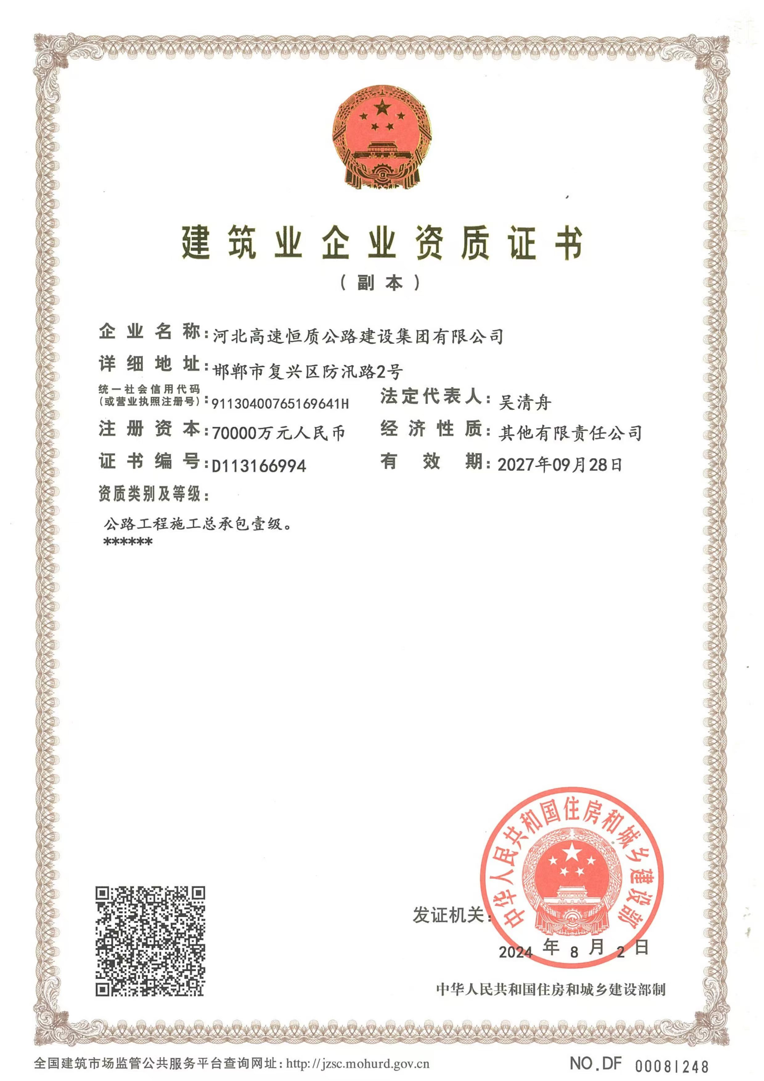 河北高速恒質(zhì)公路建設(shè)集團(tuán)有限公司始建于2004年,前身是邯鄲市恒質(zhì)公路建設(shè)集團(tuán)有限公司。2024年7月成為河北高速公路集團(tuán)有限公司二級(jí)子公司,現(xiàn)有職工500余人,下轄18家子公司13個(gè)分公司,參股公司3家 ,注冊(cè)資本7億元,是一家集公路工程施工、路用材料研發(fā)生產(chǎn)、試驗(yàn)檢測(cè)、瀝青貿(mào)易、公鐵物流于一體的多元化、綜合性單位,國(guó)家級(jí)高新技術(shù)企業(yè),河北省專精特新中小企業(yè),河北省首家瀝青拌合環(huán)保引領(lǐng)性企業(yè)。公司擁有公路工程總承包壹級(jí)、公路交通工程(公路安全設(shè)施)專業(yè)承包壹級(jí)、機(jī)電工程施工總承包貳級(jí)、電力工程施工總承包貳級(jí)、市政公用工程施工總承包貳級(jí)、建筑工...